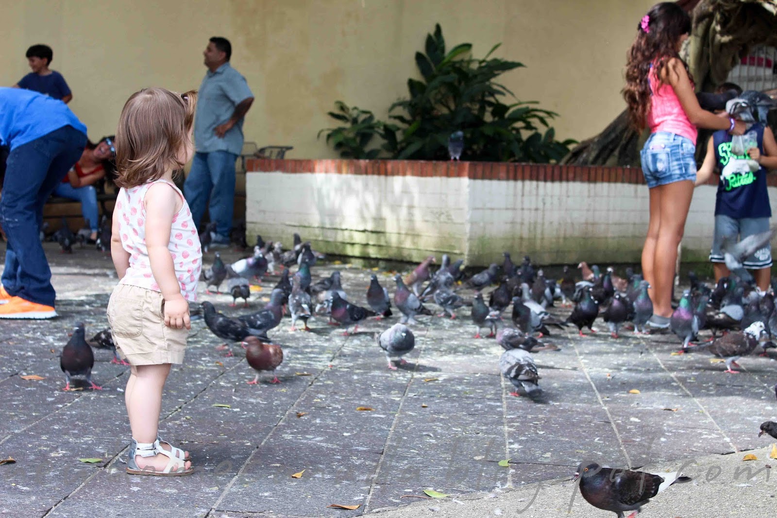 Alice and the pigeons in the Parque de las Palomas