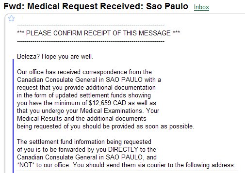 Recebemos por e-mail o aviso da empresa que está nos intermediando (em Toronto) que ontem os documentos do consulado tinham chegado. Semana que vem estaremos com a tão esperada cartinha em mãos e já vamos marcar os exames com um médico em Curitiba.