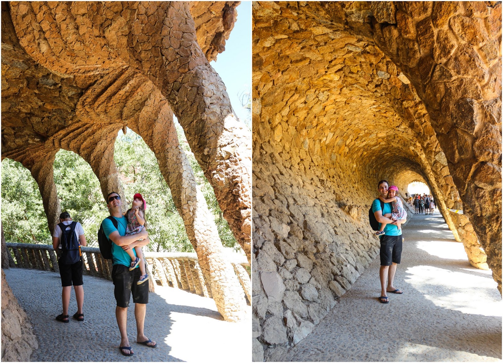 O Parc Güell foi uma aventura pra nós, já que não estávamos por dentro que a chegada até lá era meio complicadinha, especialmente com crianças (também não sei se tomamos o caminho mais difícil, mas enfim). Depois de subir ladeiras, se apertar em escadas rolantes estreitas, subir diversos lances de escadas com o carrinho e a Alice nos braços, andar por caminhos irregulares, etc, entramos e passeamos um pouco pela área dos monumentos. Pelo menos até a chegar na entrada, passamos por áreas com lindas vistas da cidade e amenizou nosso cansaço hehehe.